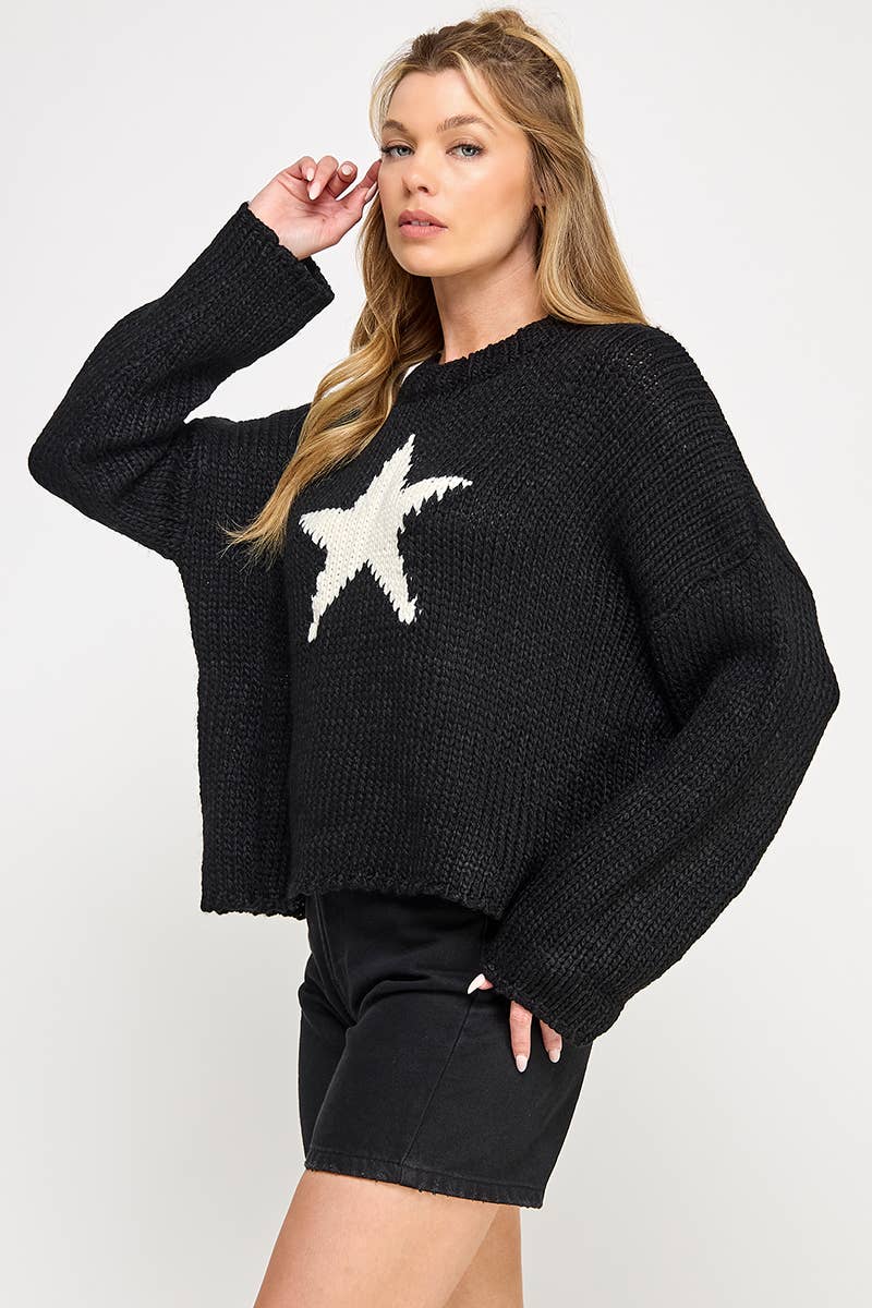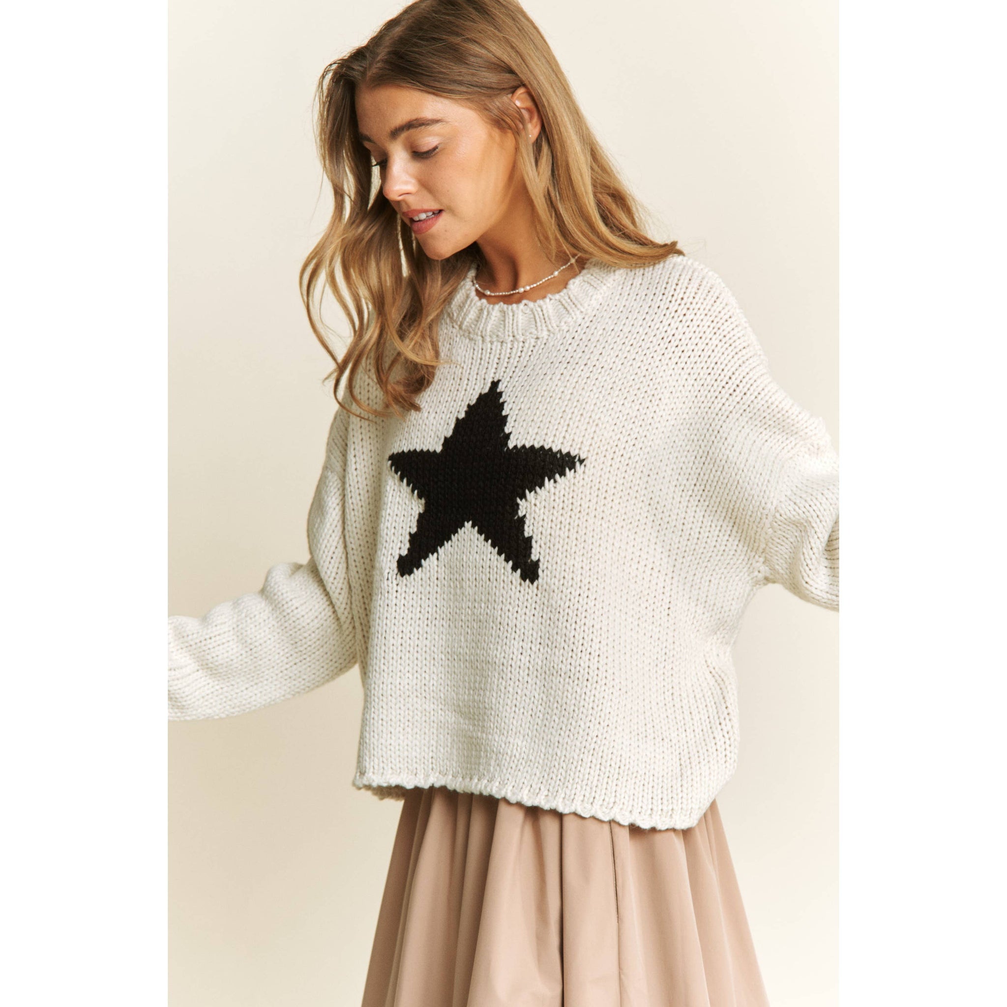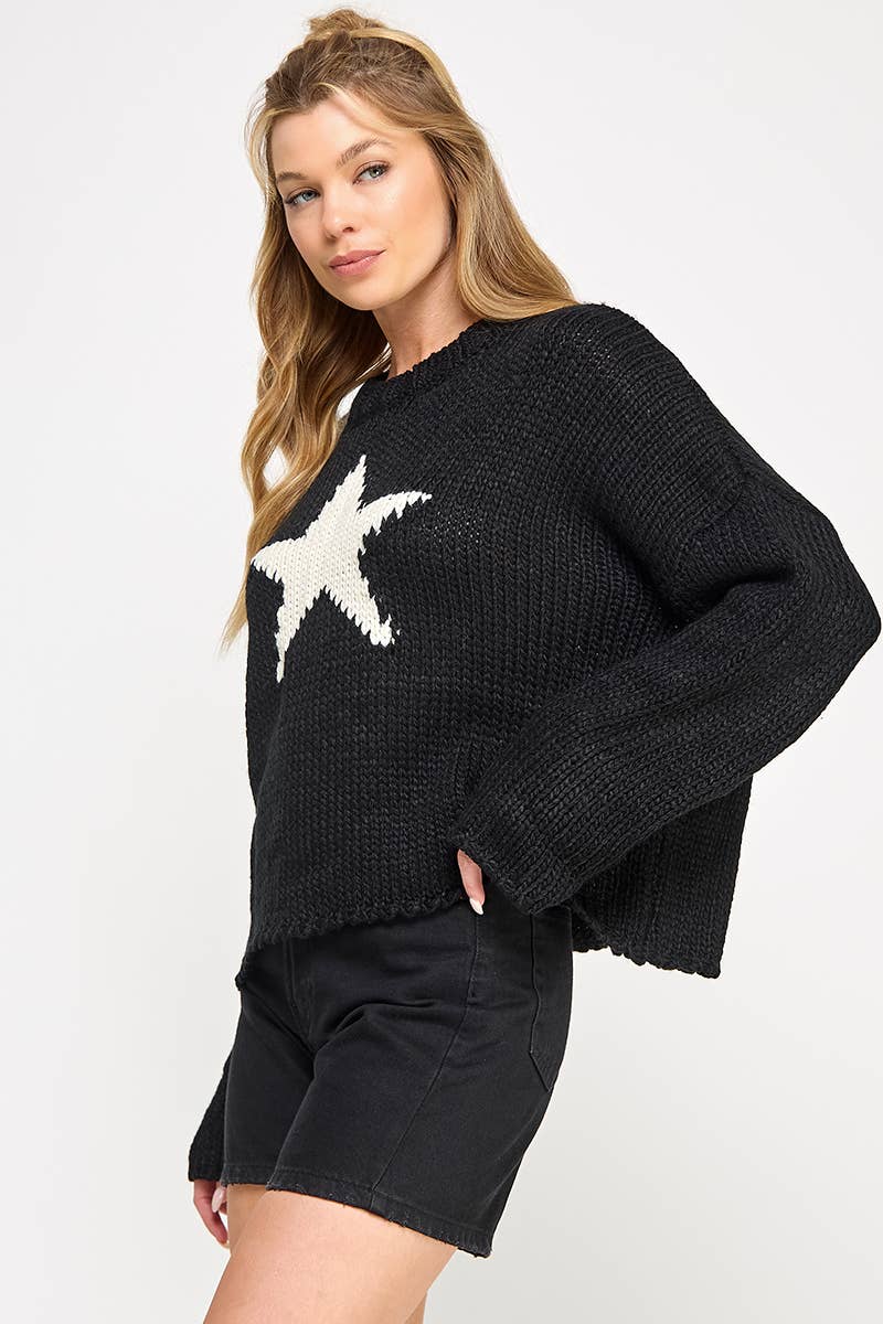 Medium-weight soft knitting sweater - Contrast STAR pattern on front - Rib bands on neckline - Loose fit crop