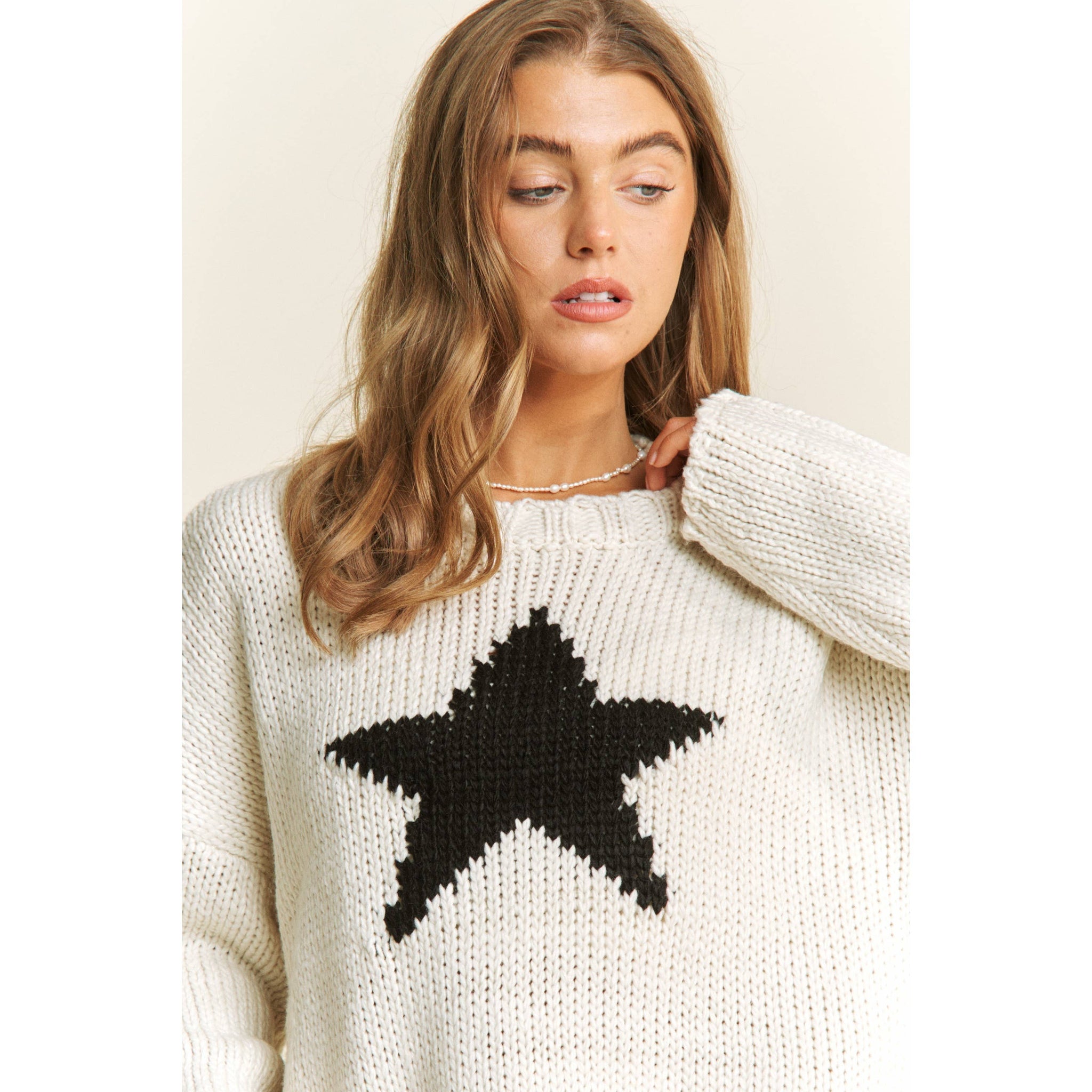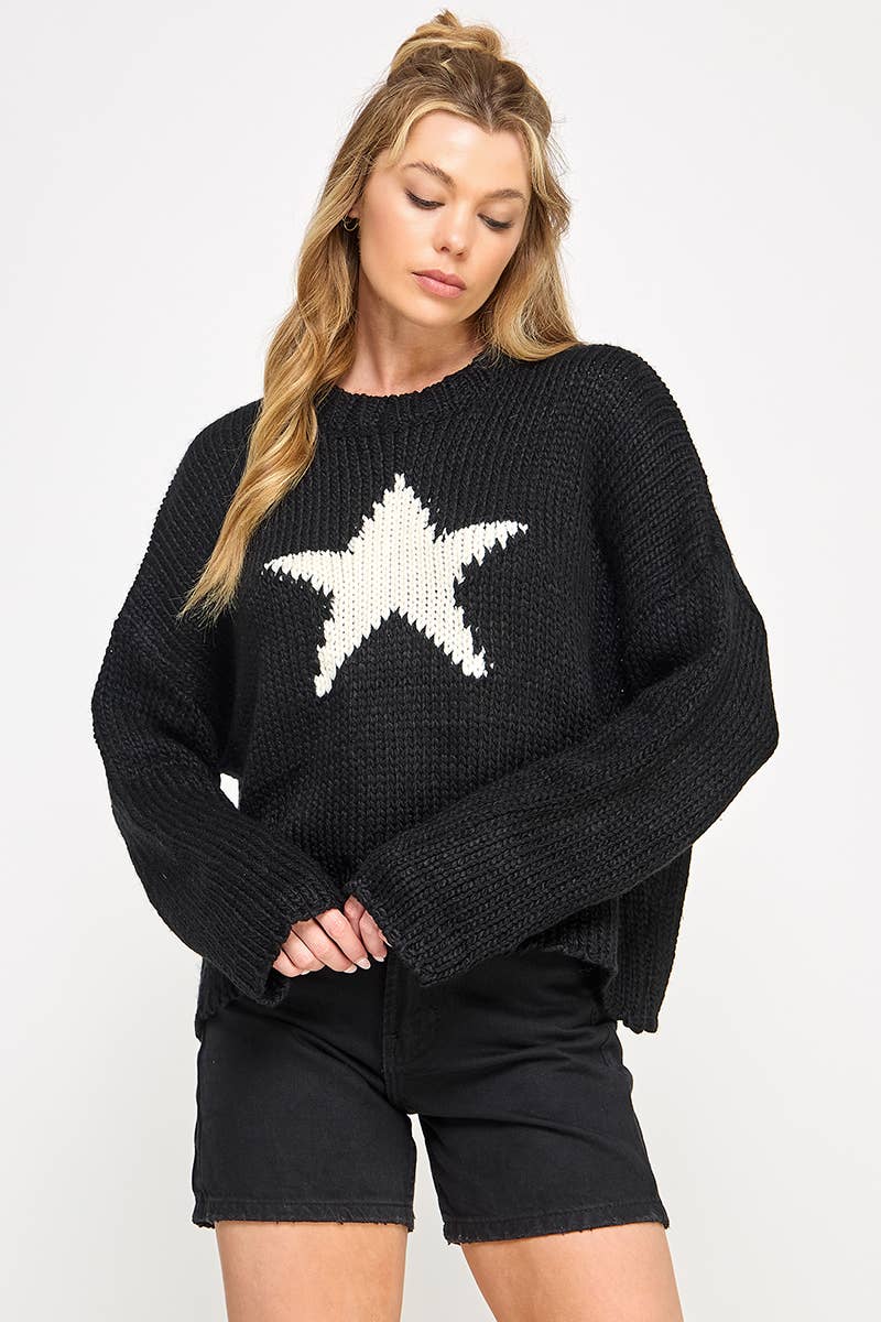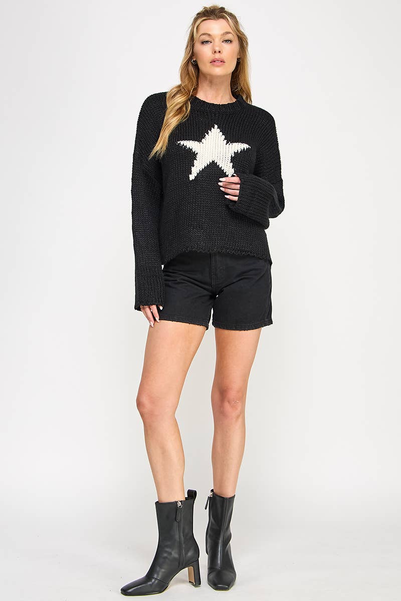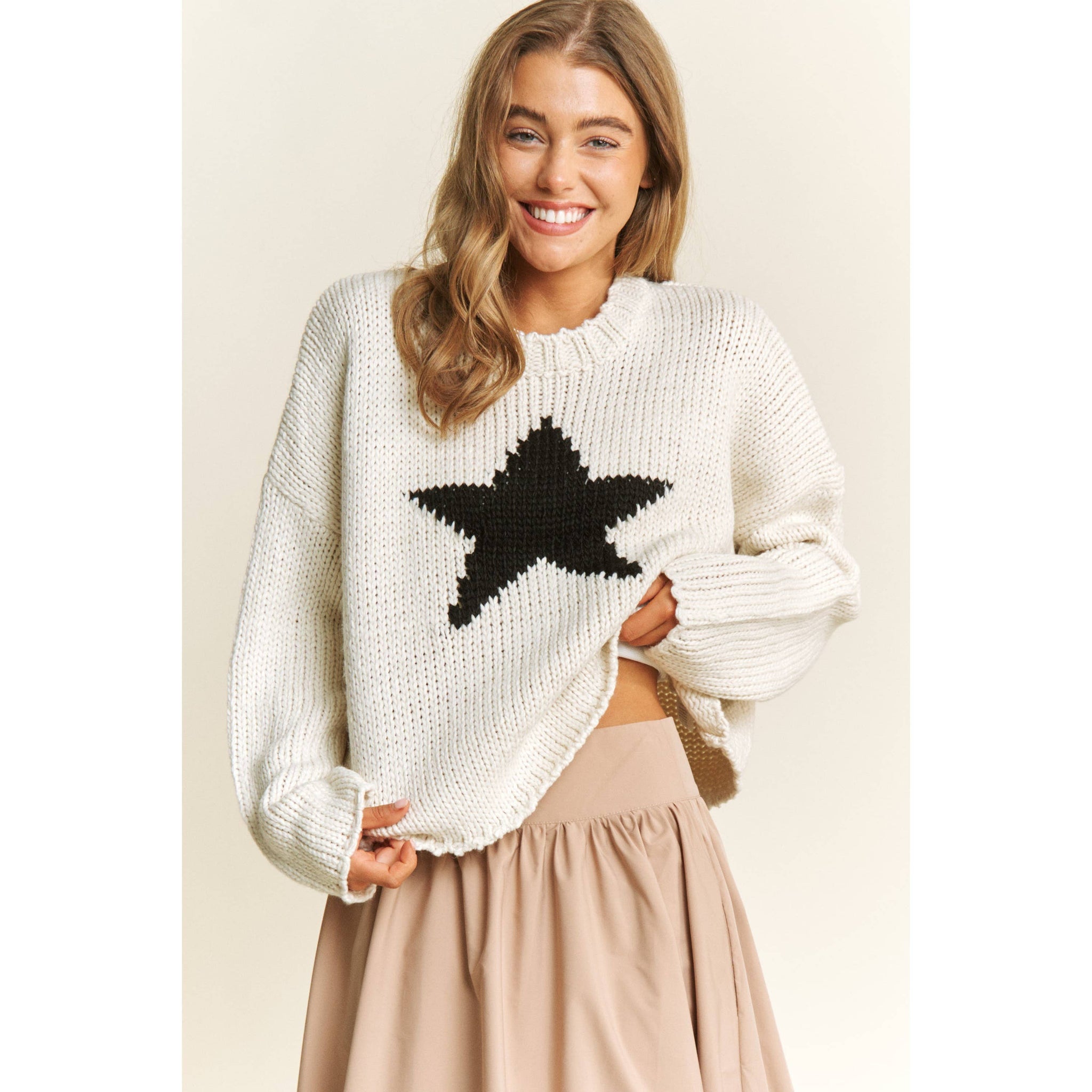 Medium-weight soft knitting sweater - Contrast STAR pattern on front - Rib bands on neckline - Loose fit crop