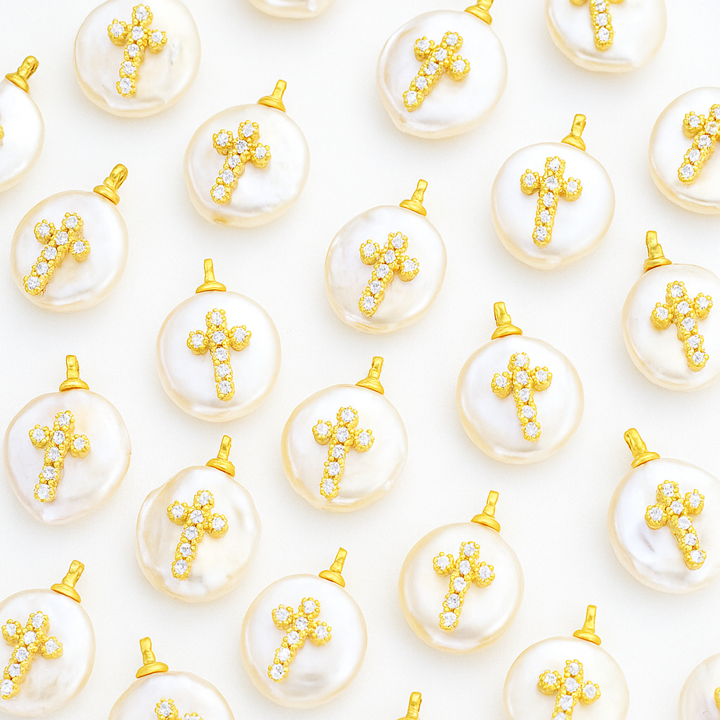 Sparkle with purpose! This adorable zirconia pearl drop cross charm brings beachy vibes and spiritual flair to your collection. Featuring shimmering cubic zirconia stones paired with a lustrous pearl drop, it's the perfect blend of glam and grace. Mix, match, and layer it with your favorite pieces for an effortlessly chic look that speaks to your soul.