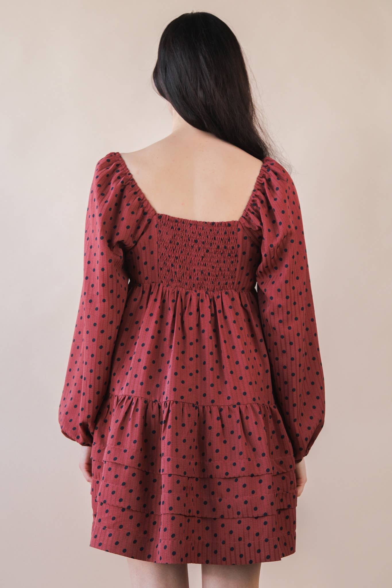 Polka Dot Printed Tiered Layers Mini Dress - Square Neck - Long Sleeve - Back Smocking - W/ Lining