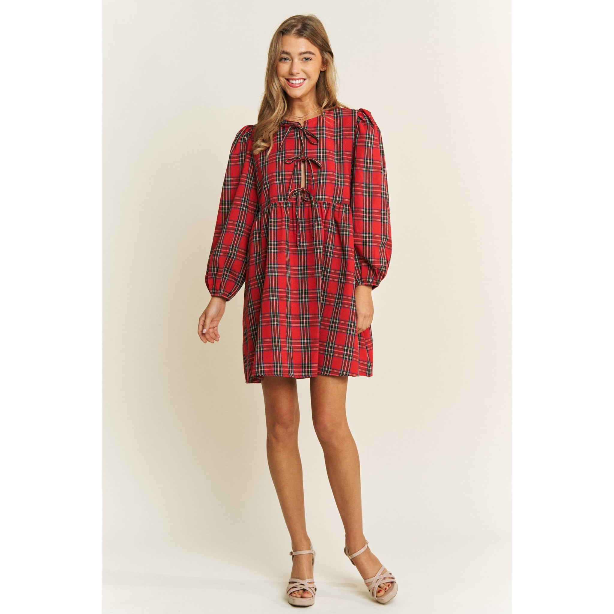 SOFT PLAID WOVEN FABRIC BABYDOLL BOW MINI DRESS