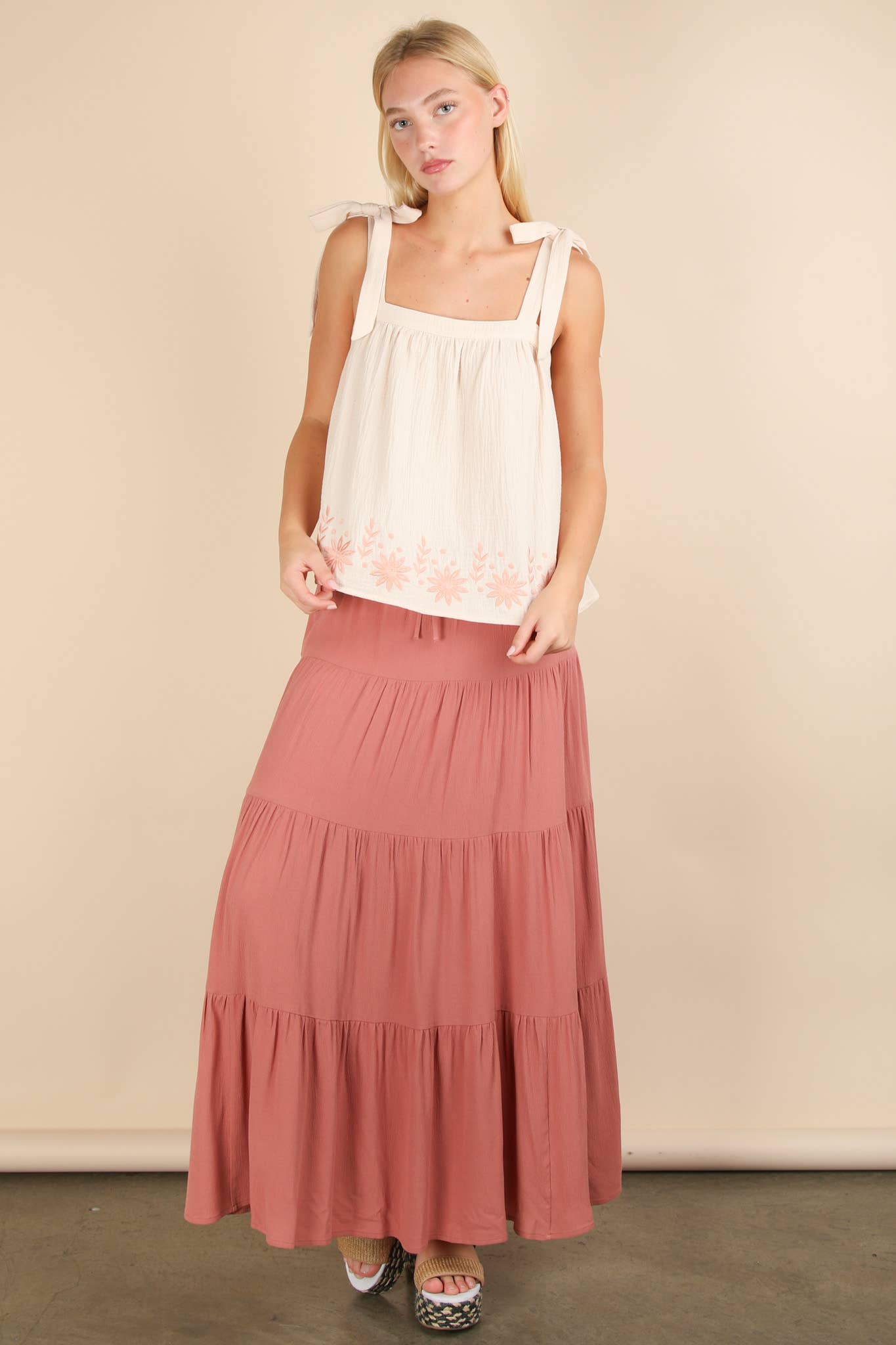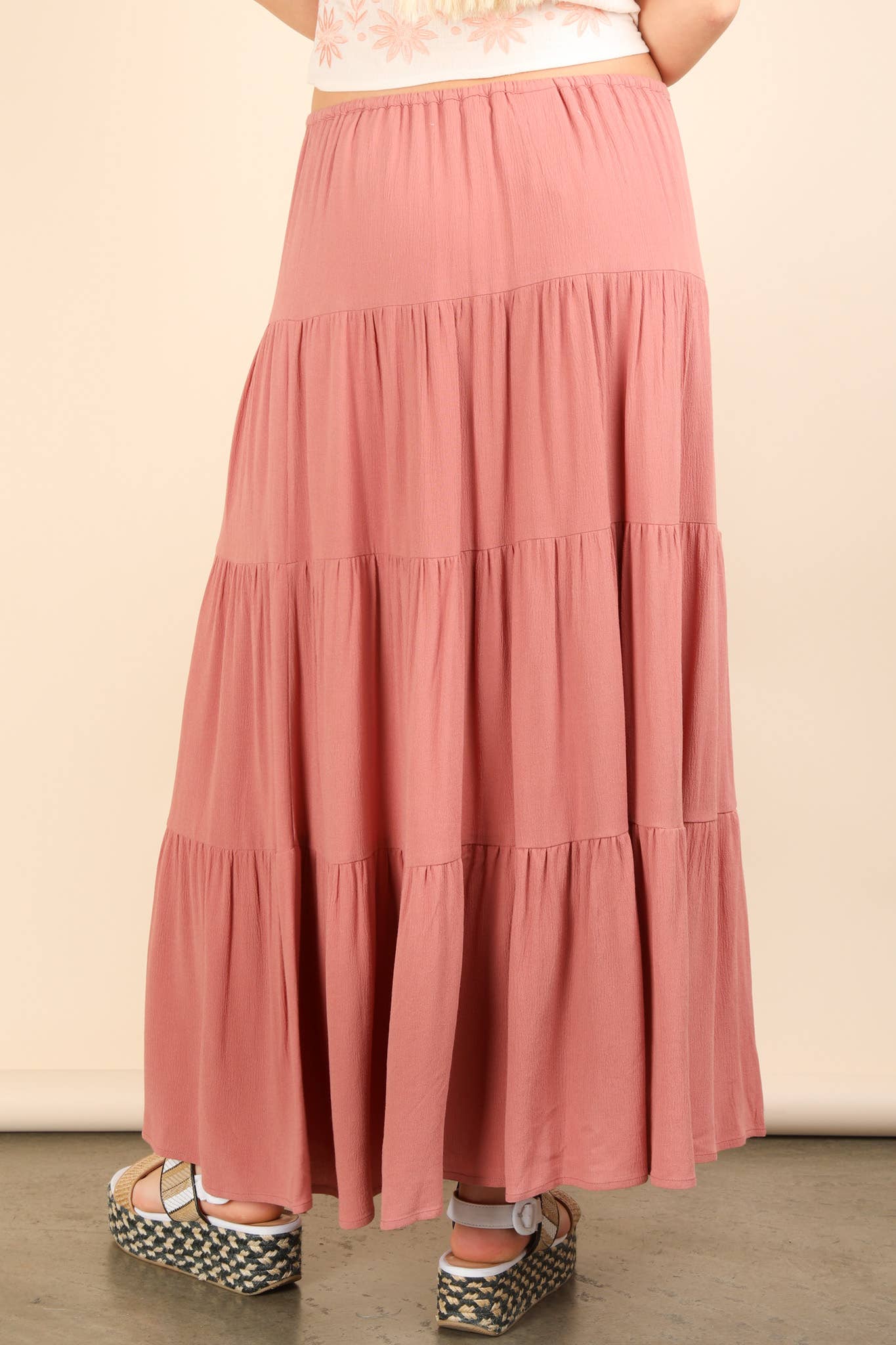 Tiered Layers Woven Midi Skirt - Elastic Waist W/ Strap - Shirring Detail - W/ Lining