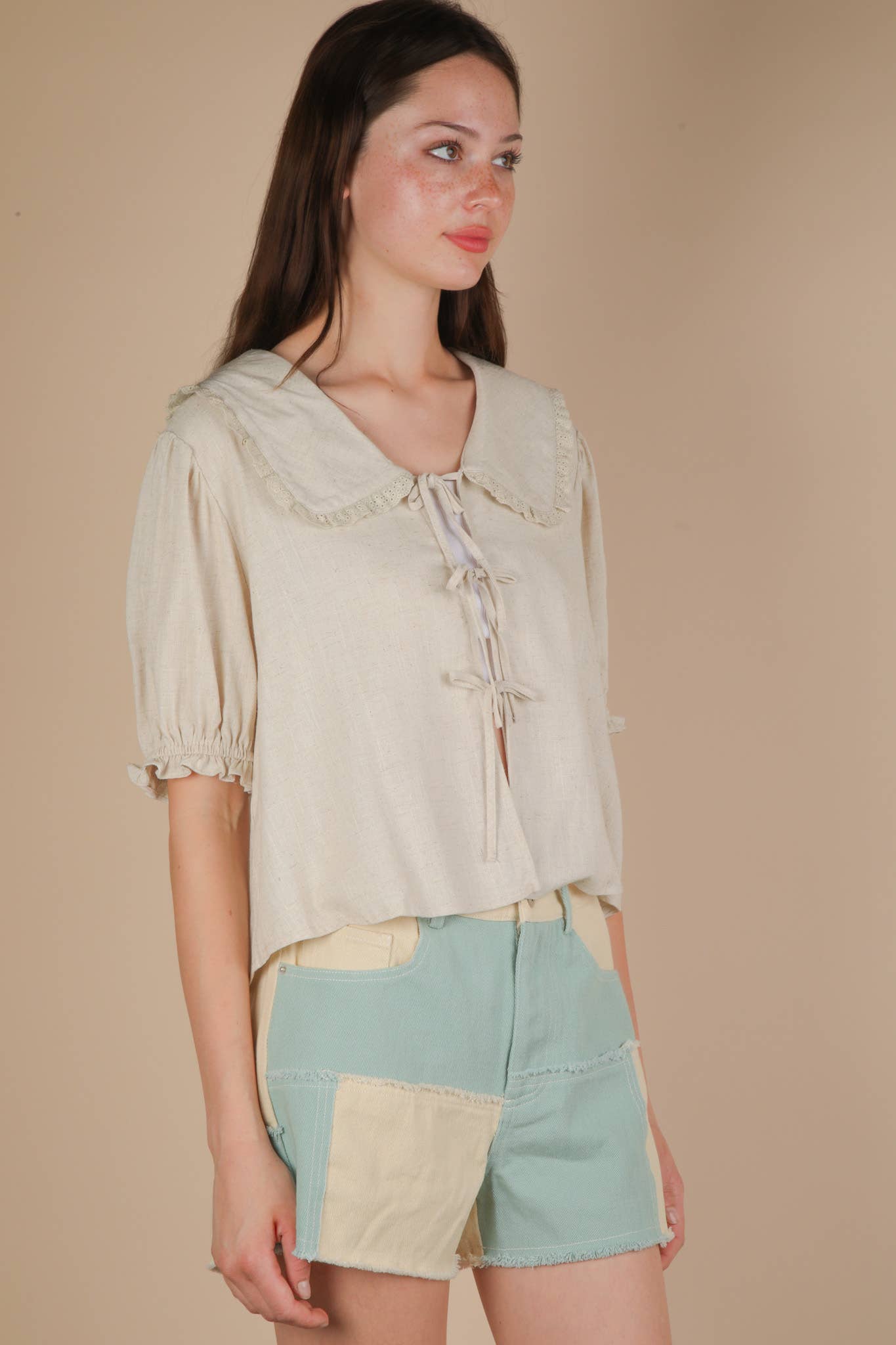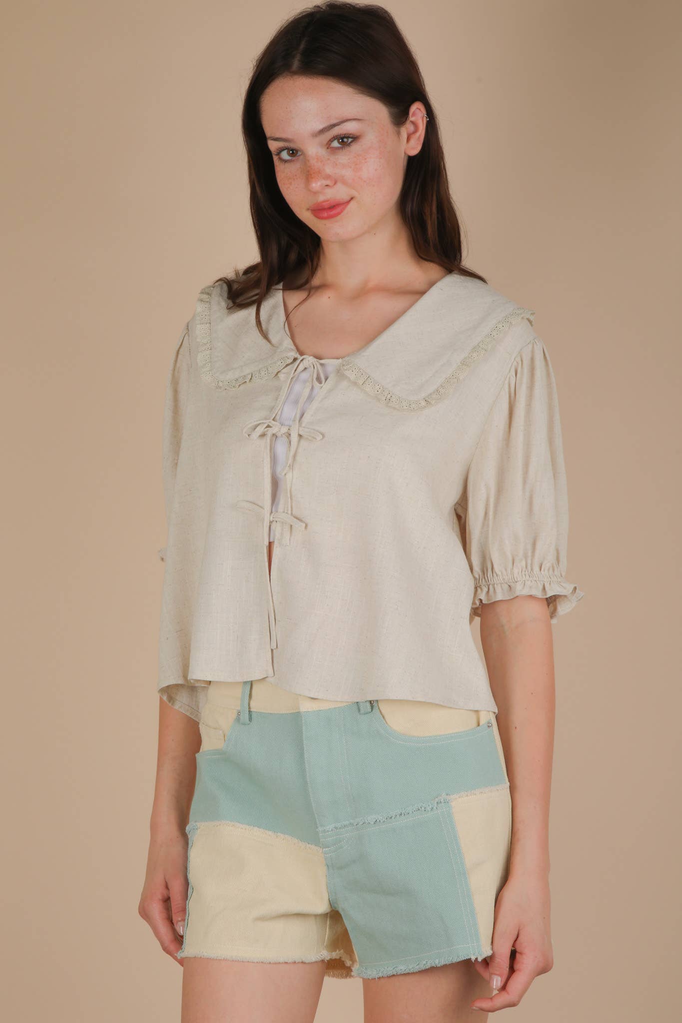 Eyelet Trim Detail Puff Sleeve Blouse - Wide Collar - Front Tie - Short Sleeve